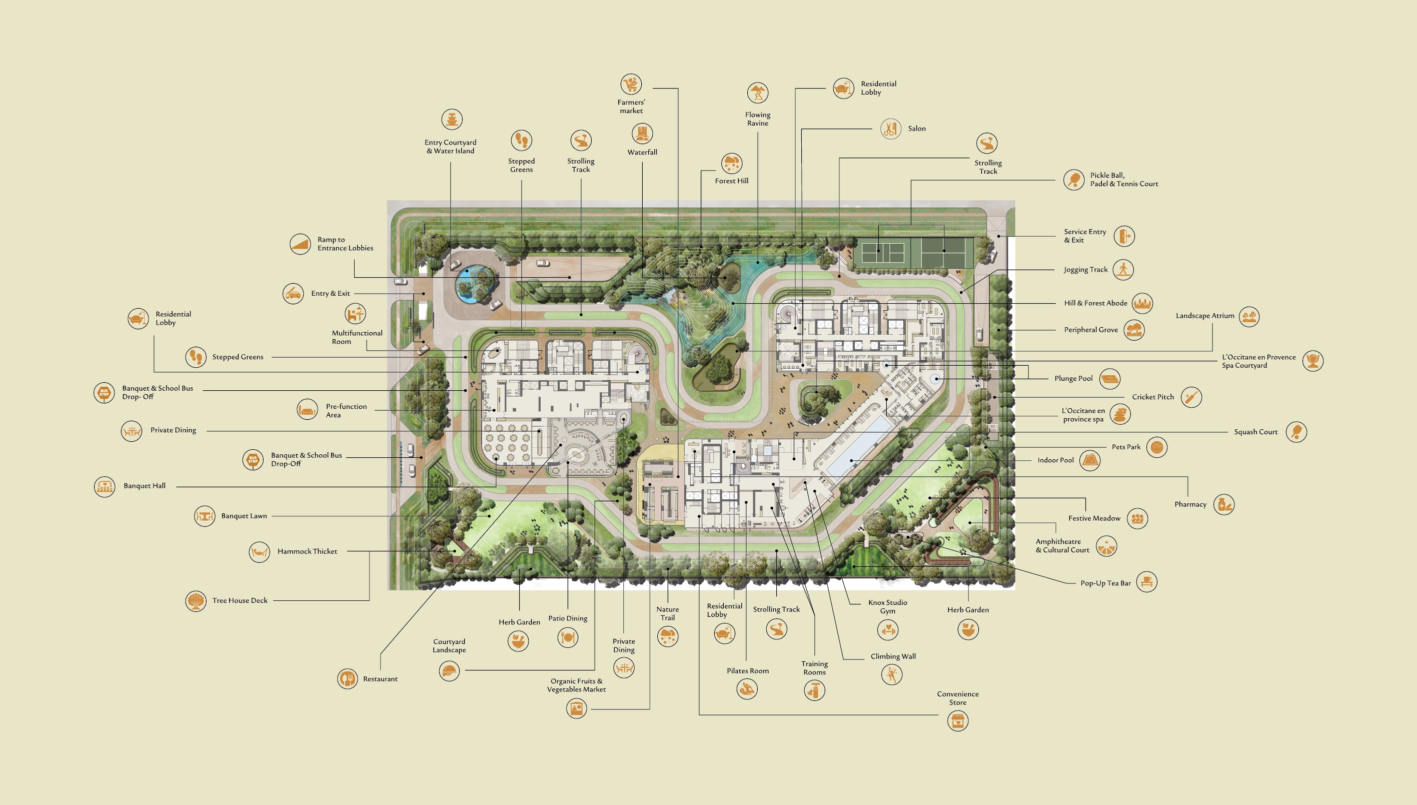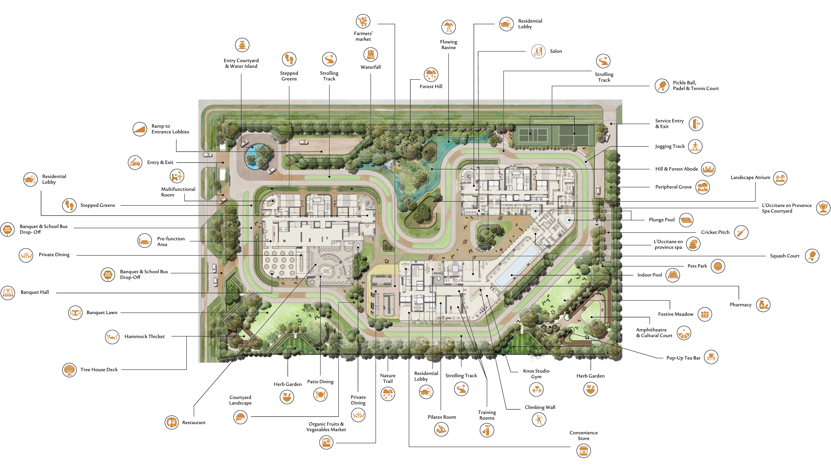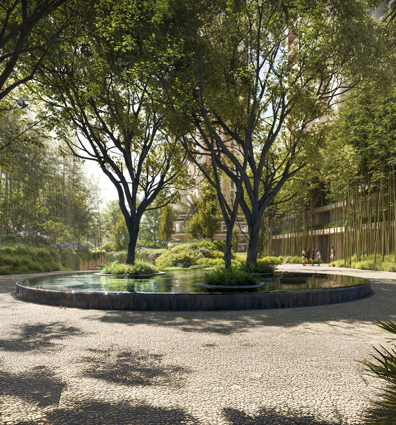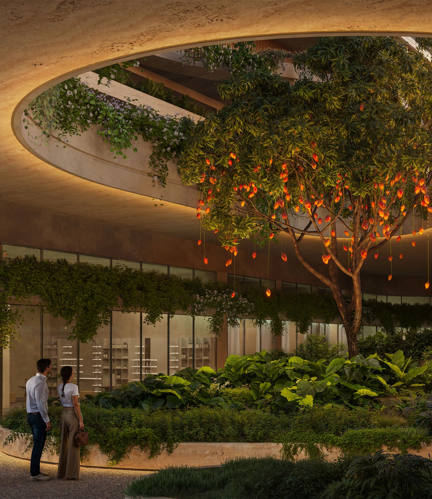 65% native greens with biophilic architecture that softens every sightline
